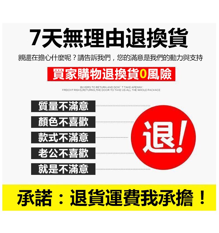 收到商品之日起7天內,在不影響二次銷售的情況下,我們提供退/換貨服務;您可以聯繫網頁客服或郵件 提交退/換貨申請。